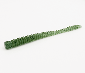 先端部のヘッド部分の形状は針が差しやすく、また針がズレにくくする為の形状となっており、ボディにある35にも及ぶリブの数との絶妙なバランスを保ちロッドアクションによるジグヘッドや先端部からの動きにテールが追従します。テール部分の特徴的なくびれによる効果でより大きくテールを躍動させイソメやゴカイなどの多毛類が漂っている姿を演出し、テールの尖った三角形の先端で鰺やメバル等の根魚、チヌや真鯛など魚種を問わずアピールします。